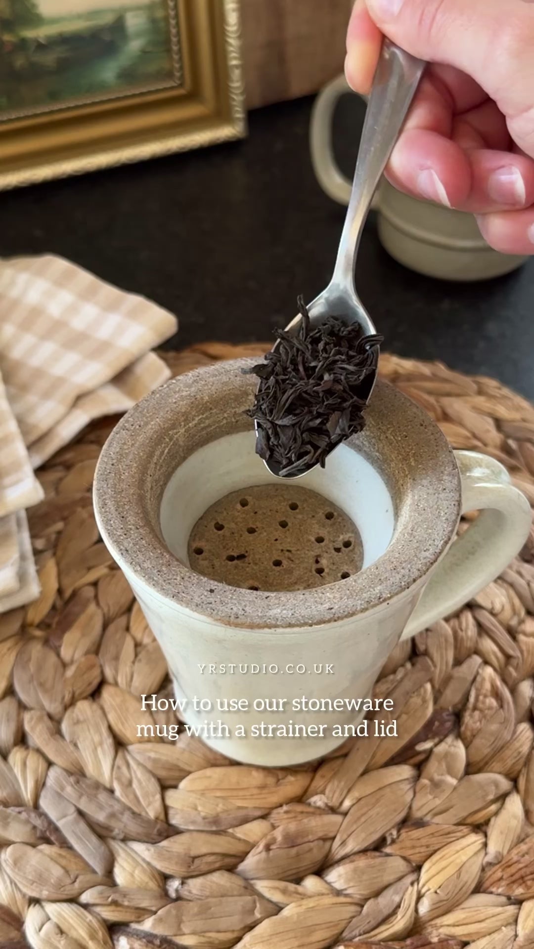 Enjoy a cup of tea with hand-glazed rustic speckled tea cup with a strainer and lid. Easy to use: just place loose leaf tea in the strainer, brew, and rest the strainer on the upturned lid when done. A charming and practical addition to your kitchen with its unique, rustic design.